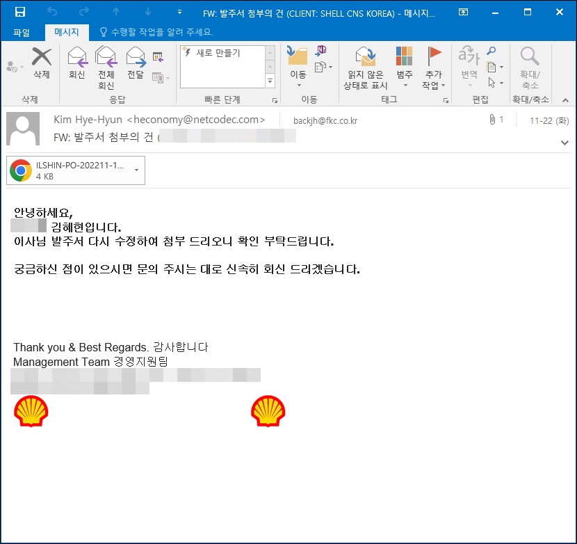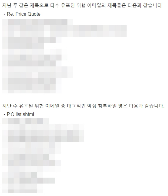 이번주 Pick으로는 발주서를 위장하여 유포 중인 Phishing 이메일을 선정했습니다. 구체적인 회사명과 담당자의 정보를 작성하여 사용자들을 속이고 있습니다.