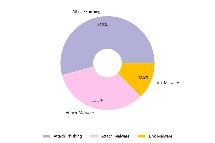 악성 이메일을 유형별로 살펴보면 24건 중 Attach-Phishing형이 54.2%로 가장 많았고 뒤이어 Attach-Malware형이 33.3%를 나타냈습니다.