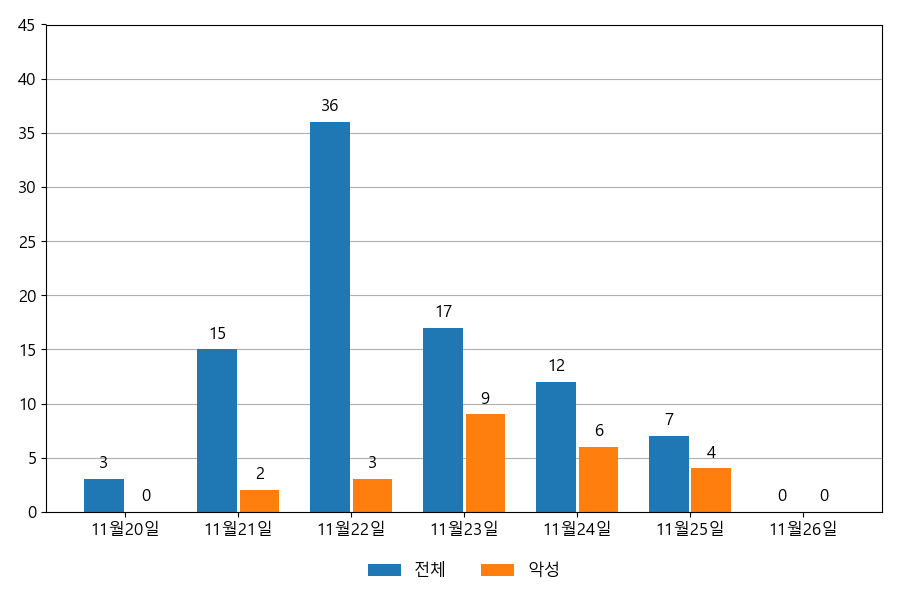 일일 유입량은 하루 최저 3건(악성 2건)에서 최대 36건(악성 9건)으로 일별 편차를 확인할 수 있습니다.