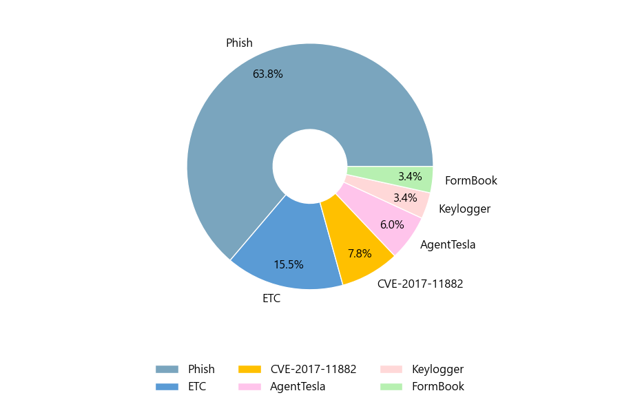 첨부파일은 ‘Phish’형태가 63.8%로 제일 큰 비중을 차지했고 뒤이어 ‘ETC’, ‘CVE-2017-11882’가 각각 15.5%, 7.8%의 비중을 차지했습니다.