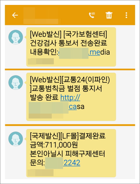 다음은 건강검진 스미싱 문자들을 정리한 것입니다.