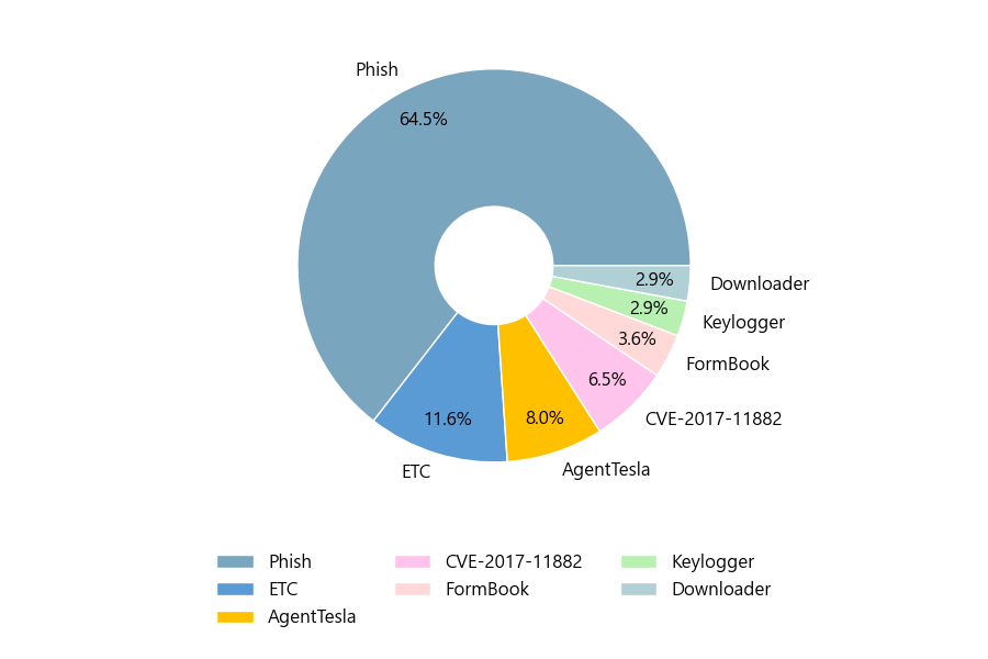 첨부파일은 ‘Phish’형태가 64.5%로 제일 큰 비중을 차지했고 뒤이어 ‘ETC’, ‘AgentTesla’가 각각 11.6%, 8.0%의 비중을 차지했습니다.
