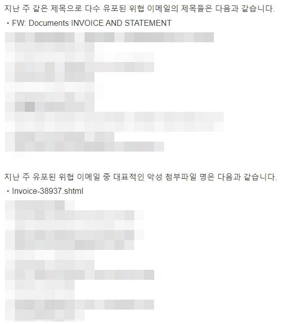 지난주 이메일 유입량은 총 30건이고 그중 악성은 18건으로 60.0%의 비율을 보였습니다. 악성 이메일의 경우 그 전주 24건 대비 18건으로 6건이 감소했습니다.