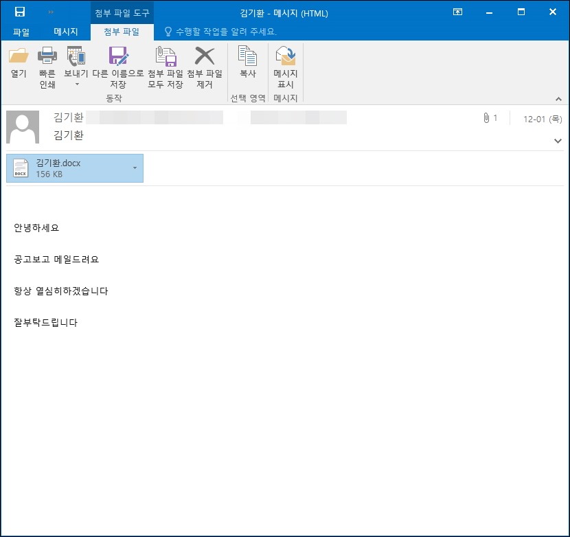 상기 이메일과 첨부파일을 확인할 경우 주의가 필요합니다.