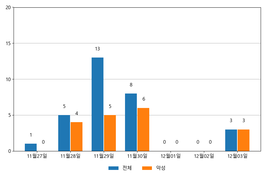 일일 유입량은 하루 최저 1건(악성 3건)에서 최대 13건(악성 6건)으로 일별 편차를 확인할 수 있습니다.