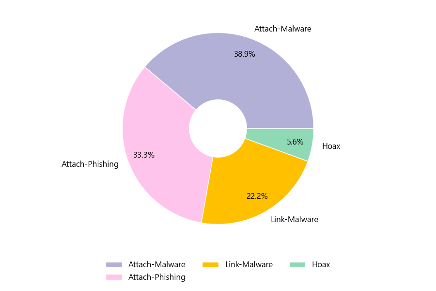 악성 이메일을 유형별로 살펴보면 18건 중 Attach-Malware형이 38.9%로 가장 많았고 뒤이어 Attach-Phishing형이 33.3%를 나타냈습니다.