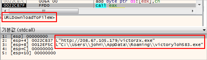 해당 shellcode는 공격자가 미리 설정해 놓은 C&C 208.67.105.179에서 추가 페이로드를 %appdata% 경로에 ‘victoryloh583.exe’ 이름으로 내려받고, 내려받은 victoryloh583.exe 파일을 실행합니다.