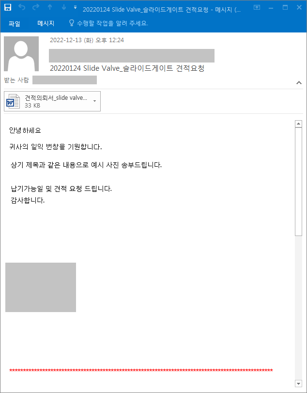기업을 대상으로 견적의뢰 사칭 피싱 메일이 대량으로 유포되고 있어 기업 사용자들의 각별한 주의가 요구됩니다.