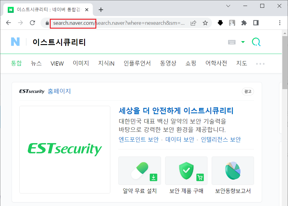 실제 피싱 페이지에서 '이스트시큐리티'를 검색했을 경우, 네이버 검색과 유사한 검색결과가 노출됨을 알 수 있습니다.