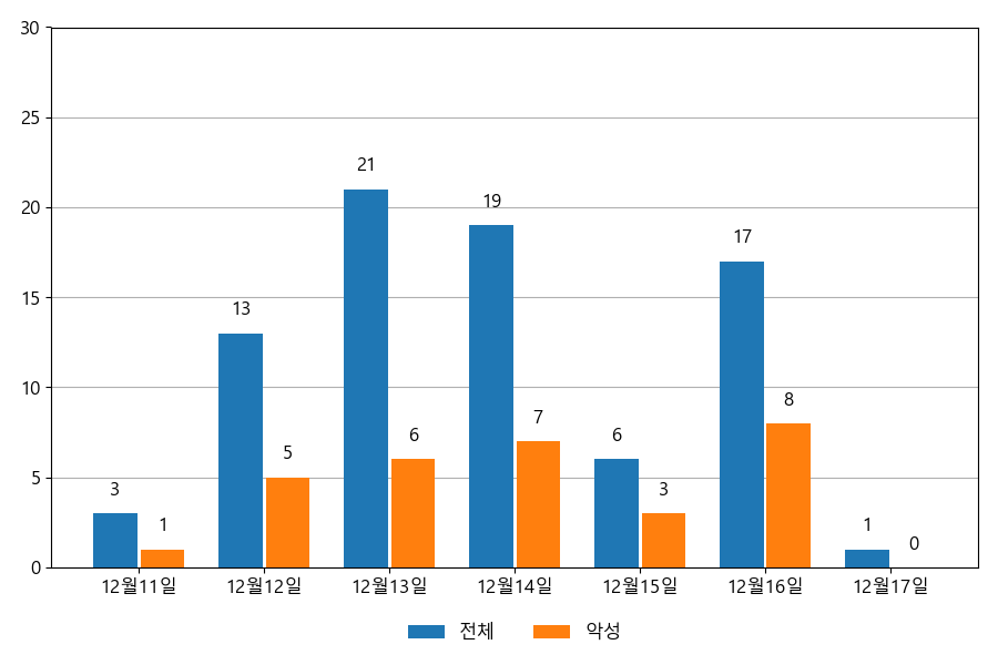 일일 유입량은 하루 최저 1건(악성 1건)에서 최대 21건(악성 8건)으로 일별 편차를 확인할 수 있습니다.