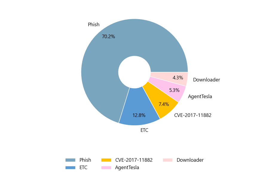 첨부파일은 ‘Phish’형태가 70.2%로 제일 큰 비중을 차지했고 뒤이어 ‘ETC’, ‘CVE-2017-11882’가 각각 12.8%, 7.4%의 비중을 차지했습니다.