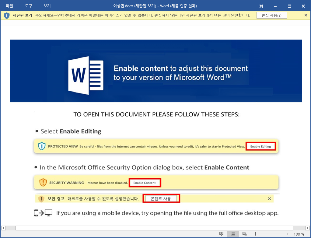 워드 파일을 실행하면 "콘텐츠 사용"과 "편집 사용" 등 버튼 클릭을 유도하는 이미지가 나타납니다. 처음부터 클릭 유도 이미지 이외에 다른 콘텐츠는 포함하고 있지 않으며 "편집 사용"을 누를 시 추가적으로 악성코드를 내려받아 악의적인 행동을 시도합니다.