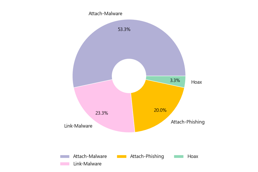 악성 이메일을 유형별로 살펴보면 30건 중 Attach-Malware형이 53.3%로 가장 많았고 뒤이어 Link-Malware형이 23.3%를 나타냈습니다.