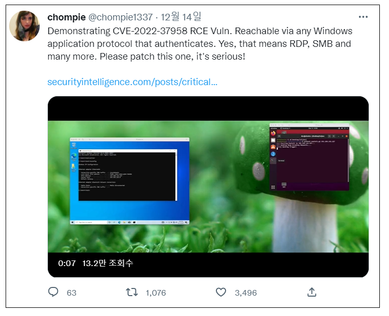 해당 취약점은 2017년 전 세계적으로 큰 피해를 입힌 워너크라이(WannaCry)랜섬웨어가 악용한 SMB 취약점 'EternalBlue 취약점'보다 더 큰 파급력을 가지고 있다고 평가되고 있습니다. SMB 프로토콜에만 영향을 미쳤던 EternalBlue(CVE-2017-0144) 취약점과 달리 CVE-2022-37958 취약점은 더 넓은 범위의 네트워크 프로토콜에 존재하기 때문입니다.