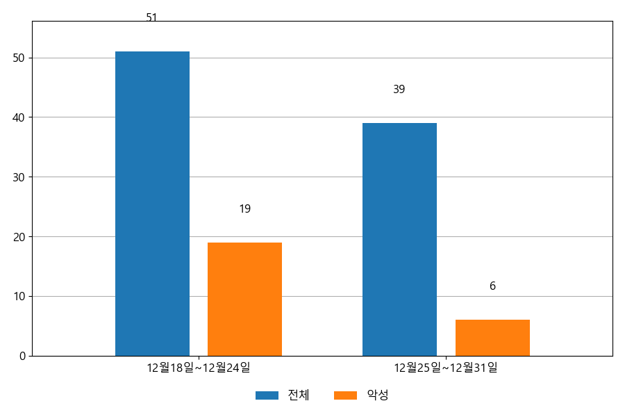 ESRC에서는 자체 운영 중인 이메일 모니터링 시스템의 데이터를 통해 이메일 중심의 공격이 어떻게 이루어지고 있는지 공유하고 있습니다. 다음은 12월 25일~12월 31일까지의 주간 통계 정보입니다.
