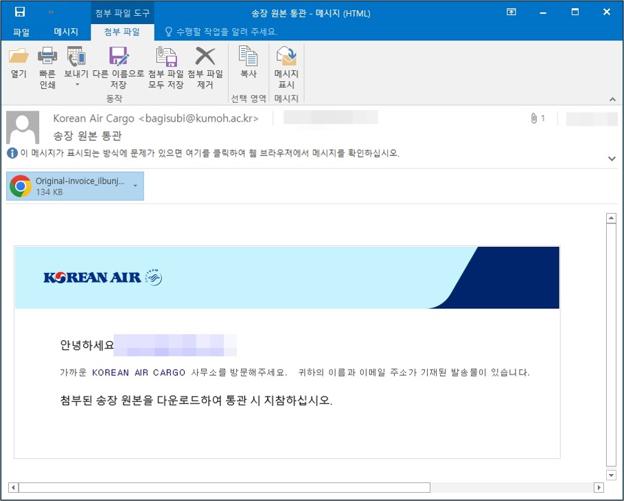 상기 이메일과 첨부파일을 확인할 경우 주의가 필요합니다.