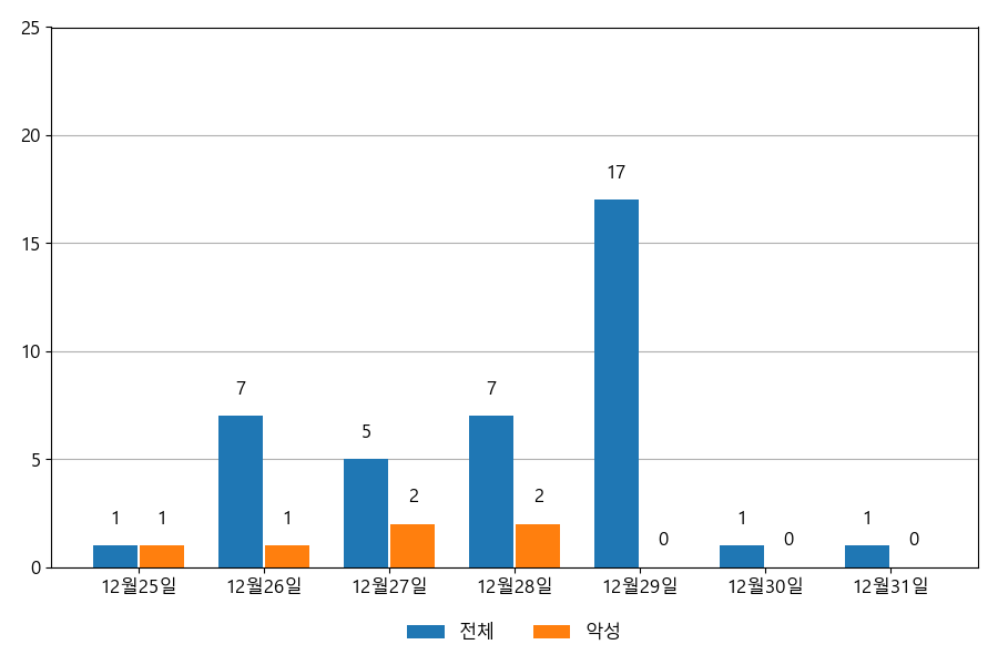 일일 유입량은 하루 최저 1건(악성 1건)에서 최대 17건(악성 2건)으로 일별 편차를 확인할 수 있습니다.