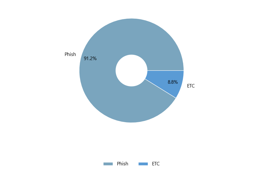 첨부파일은 ‘Phish’형태가 91.2%로 제일 큰 비중을 차지했고 뒤이어 ‘ETC’가 8.8%의 비중을 차지했습니다.