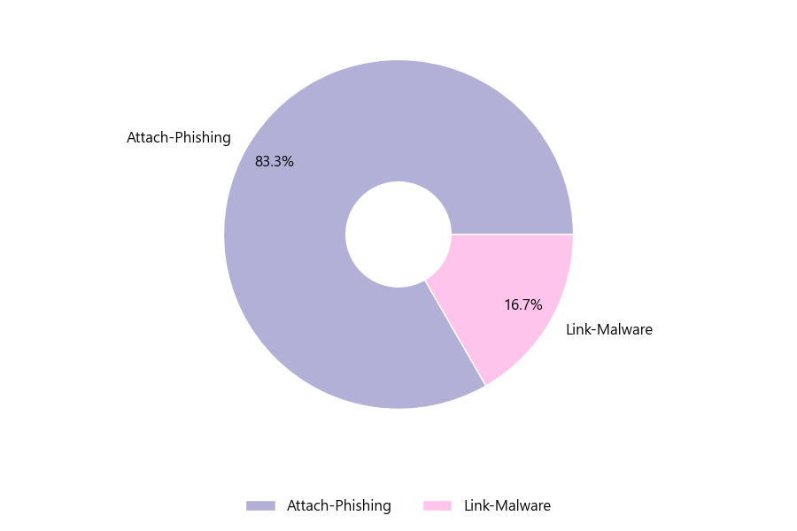 악성 이메일을 유형별로 살펴보면 6건 중 Attach-Phishing형이 83.3%로 가장 많았고 뒤이어 Link-Malware형이 16.7%를 나타냈습니다.