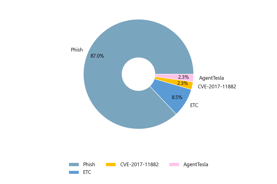 첨부파일은 ‘Phish’형태가 87.0%로 제일 큰 비중을 차지했고 뒤이어 ‘ETC’, ‘CVE-2017-11882’가 각각 8.5%, 2.3%의 비중을 차지했습니다.