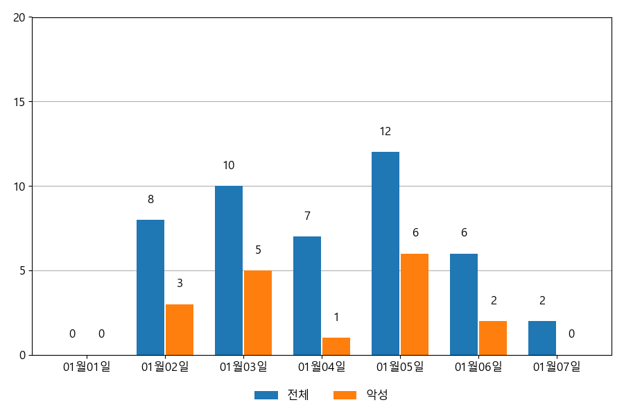 일일 유입량은 하루 최저 2건(악성 1건)에서 최대 12건(악성 6건)으로 일별 편차를 확인할 수 있습니다.
