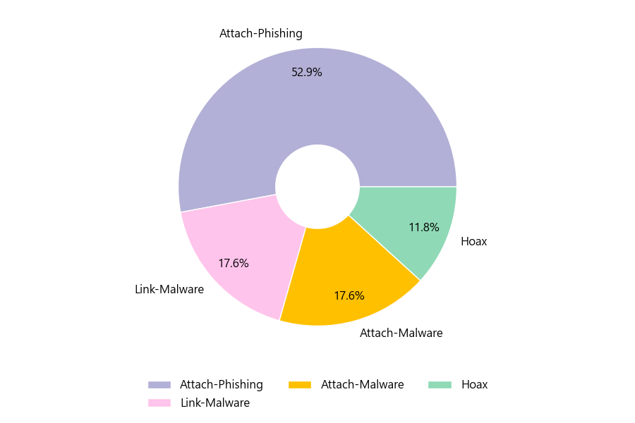 악성 이메일을 유형별로 살펴보면 17건 중 Attach-Phishing형이 52.9%로 가장 많았고 뒤이어 Link-Malware형이 17.6%를 나타냈습니다.