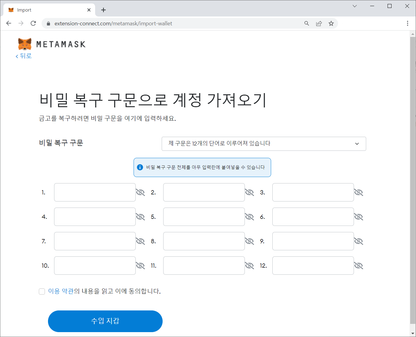 피싱 페이지는 메타마스크 복구구문(Recovery Phrase) 탈취를 시도하며, 만일 사용자가 피싱 페이지를 정상 페이지로 오인하여 피싱 페이지에 복구구문을 입력한다면, 사용자 메타마스크 지갑에 있던 가상자산들은 모두 공격자에게 넘어가게 됩니다.