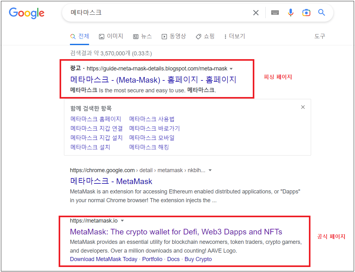 이러한 피싱 공격을 예방하기 위해서는 구글 엔진을 통한 검색 시 검색결과 창 앞에 "광고" 문구를 확인해야 합니다. 검색 결과 앞에 "광고" 문구가 붙어있을 경우 공식 페이지가 아닐 가능성이 높아 주의가 필요합니다. 또한 검색 결과에 보이는 URL을 확인하시어, 구글 검색 결과를 통해 노출되는 피싱페이지 피해를 예방하시기 바랍니다.