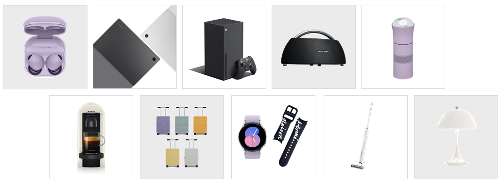 - 매일 바뀌는 실물상품의 목록은 다음과 같으며, 판매사의 사정에 따라 다른 상품으로 대체될 수 있습니다. (갤럭시 버즈2 프로, 갤럭시탭 A8, LG 퓨리케어 미니 공기청정기, 갤럭시 워치5 40mm, 엑스박스 Series S, 로우로우 캐리어, 네스프레소 버츄오플러스, 하만카돈 Go+Play 블루투스 스피커, 루이스폴센 테이블 램프, 삼성 비스포크 슬림 청소기)