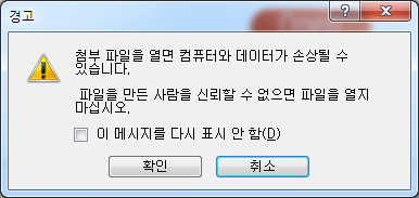 뿐만 아니라 원노트 파일 내 VBS, WSF, HTA 등의 파일 형식의 포함을 허용합니다. 이러한 형식의 파일을 실행할 때 특정 경고창을 띄우긴 하지만 사용자들은 일반적으로 이러한 경고창에 개의치 않고 '확인'을 눌러 악성스크립트가 실행되게 됩니다.
