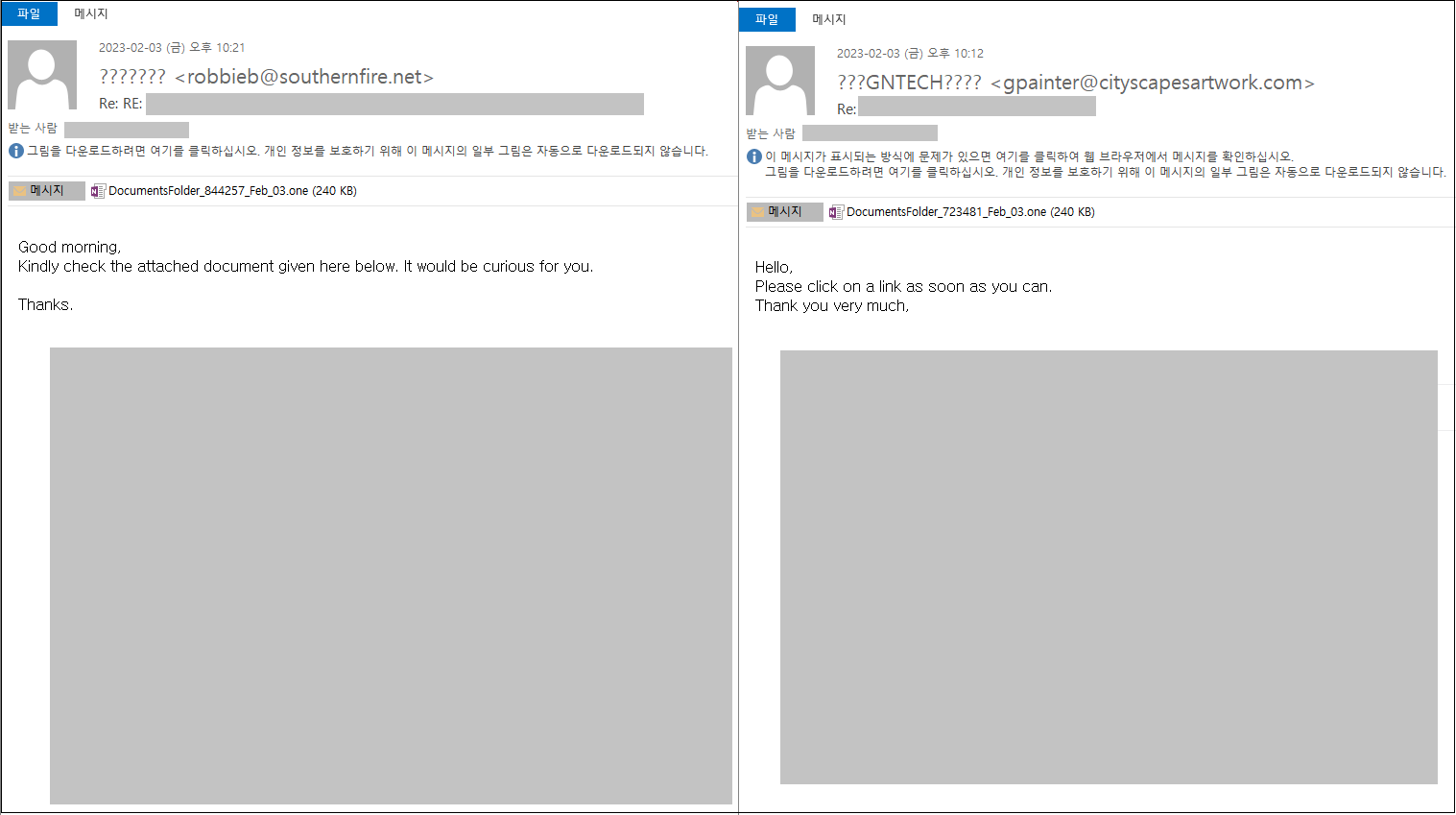 수상한 이메일 내용 하단에 정상 이메일의 내용이 포함되어 있기에 많은 사용자들이 큰 의심없이 첨부파일을 실행할 가능성이 높습니다.