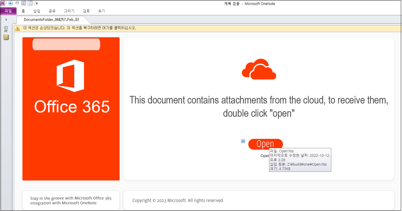 원노트 파일의 경우 MS office에 적용된 제한된 보기 및 윈도우의 기본 보호 매커니즘 중 하나인 MOTW(Mark-of-the-Web)의 영향을 받지 않습니다.