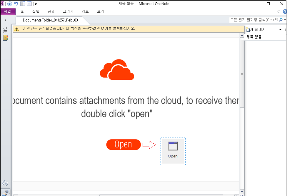 사용자가 이메일에 첨부되어 있는 원노트 파일을 실행하면 다음과 같은 화면이 보이며 [Open] 버튼을 더블클릭 하라고 안내합니다.