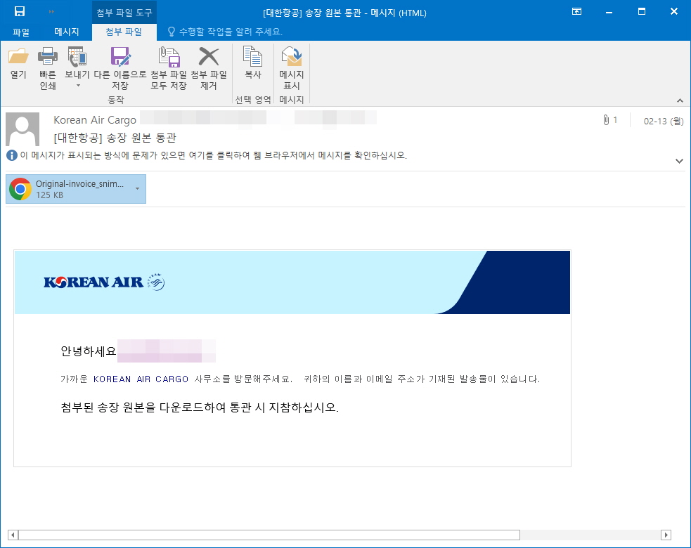 상기 이메일과 첨부파일을 확인할 경우 주의가 필요합니다.