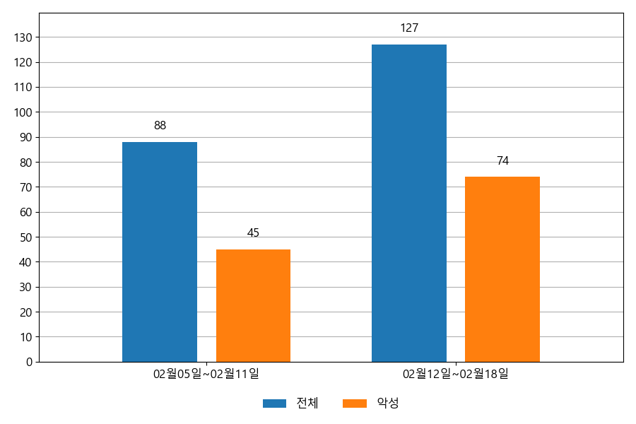 지난주 이메일 유입량은 총 127건이고 그중 악성은 74건으로 58.27%의 비율을 보였습니다. 악성 이메일의 경우 그 전주 45건 대비 74건으로 29건이 증가했습니다.