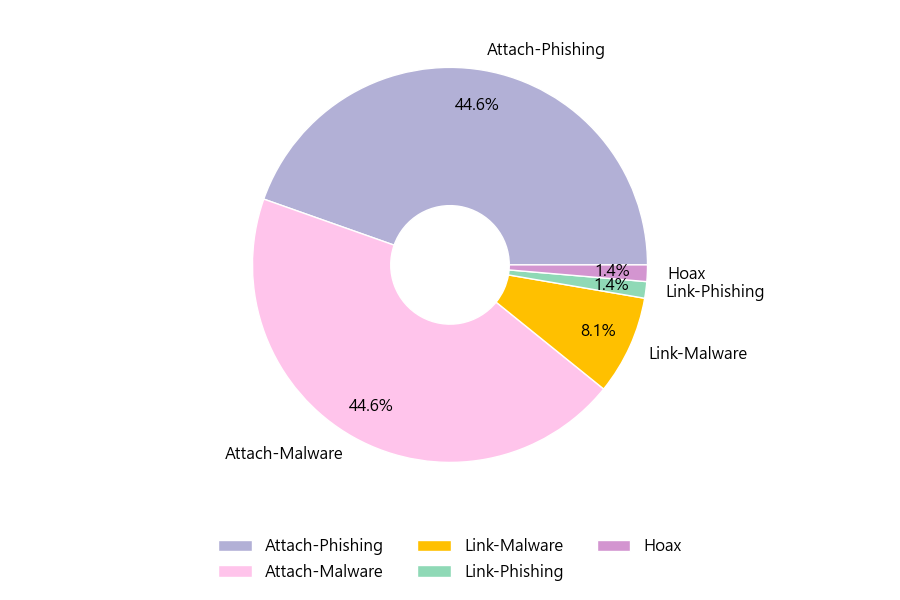 악성 이메일을 유형별로 살펴보면 74건 중 Attach-Phishing형이 44.6%로 가장 많았고 뒤이어 Attach-Malware형이 44.6%를 나타냈습니다.