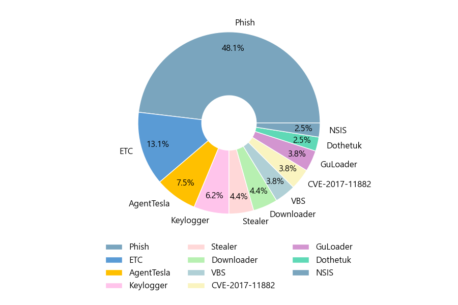 첨부파일은 ‘Phish’형태가 48.1%로 제일 큰 비중을 차지했고 뒤이어 ‘ETC’, ‘AgentTesla’가 각각 13.1%, 7.5%의 비중을 차지했습니다.