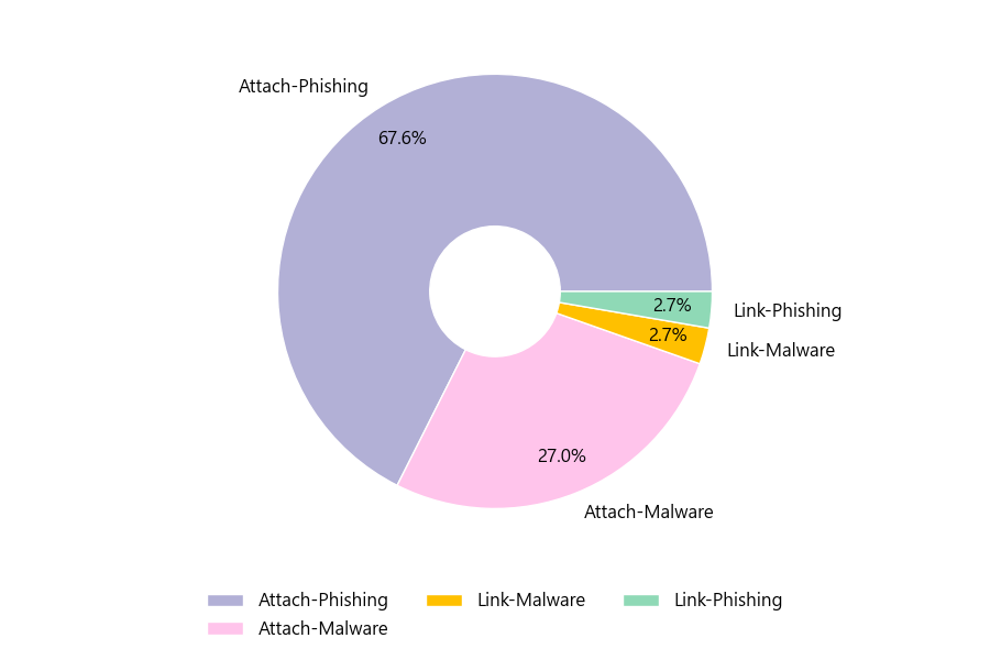 악성 이메일을 유형별로 살펴보면 37건 중 Attach-Phishing형이 67.6%로 가장 많았고 뒤이어 Attach-Malware형이 27.0%를 나타냈습니다.