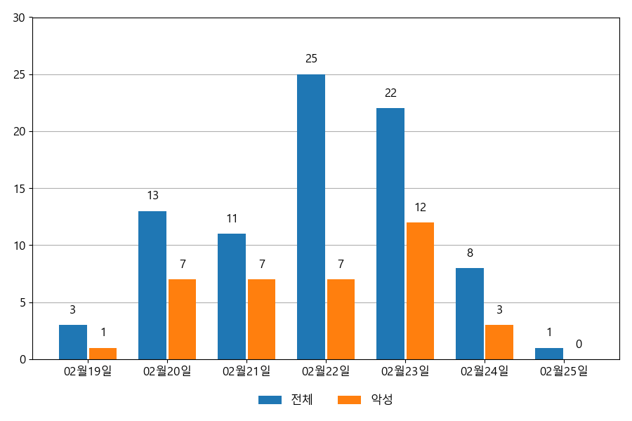 일일 유입량은 하루 최저 1건(악성 1건)에서 최대 25건(악성 12건)으로 일별 편차를 확인할 수 있습니다.