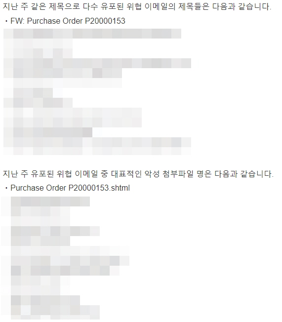 이번 주 Pick으로는 발주서로 위장하여 유포 중인 Phishing 이메일을 선정했습니다. 특히 실제 있는 기업의 명칭과 전화번호, 이름 등을 사용하여 신뢰감을 주고 있으므로 주의가 필요합니다.