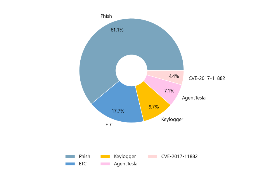 첨부파일은 ‘Phish’형태가 61.1%로 제일 큰 비중을 차지했고 뒤이어 ‘ETC’, ‘Keylogger’가 각각 17.7%, 9.7%의 비중을 차지했습니다.