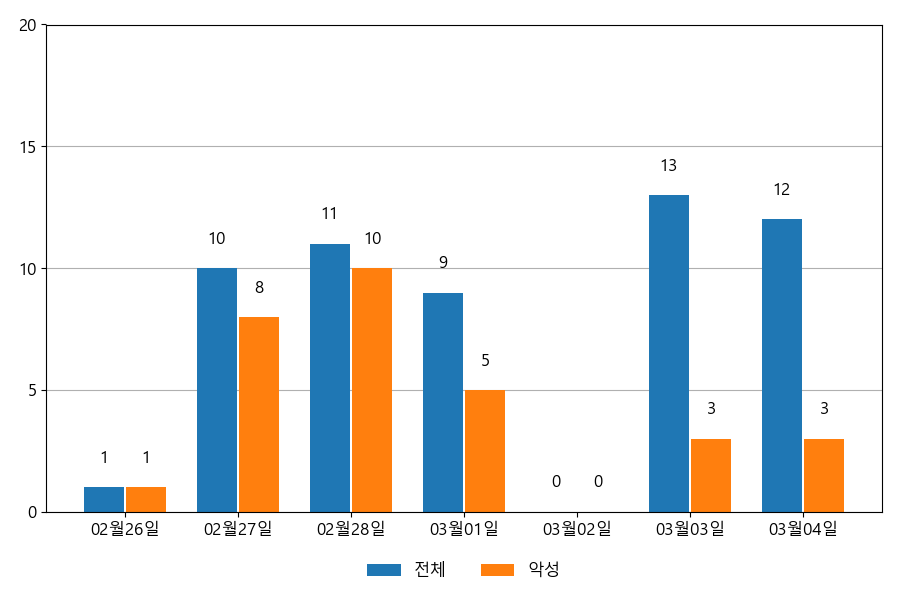 일일 유입량은 하루 최저 1건(악성 1건)에서 최대 13건(악성 10건)으로 일별 편차를 확인할 수 있습니다.