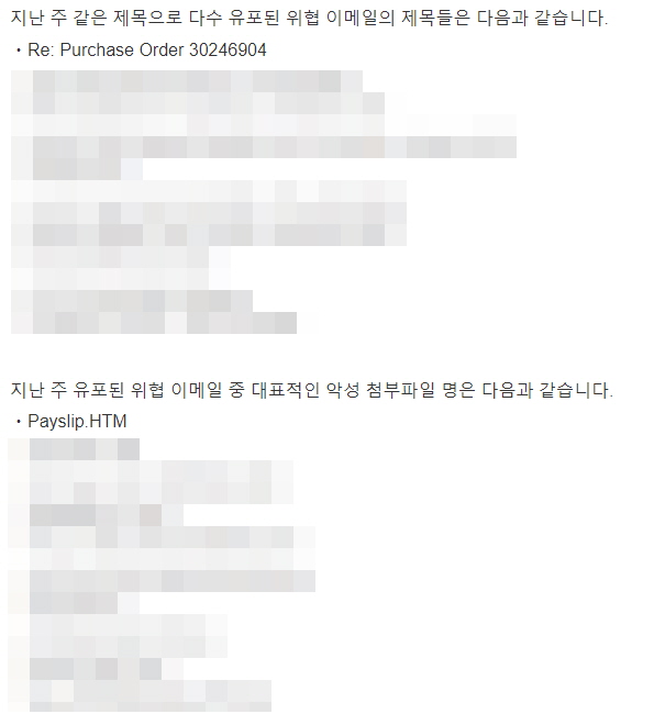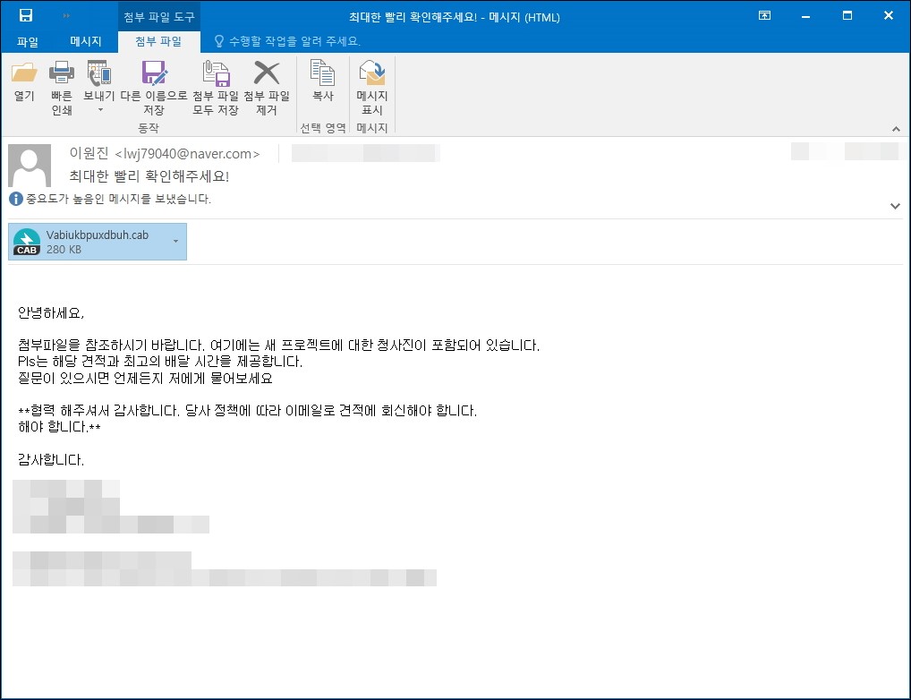 이번 주 Pick으로는 견적 파일로 위장하여 유포 중인 Phishing 이메일을 선정했습니다. 제목에서부터 급하다는 것을 강조하며 상대방의 첨부파일 클릭을 유도하기 때문에 주의가 필요합니다.