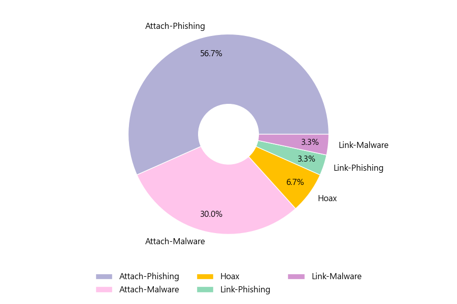 악성 이메일을 유형별로 살펴보면 30건 중 Attach-Phishing형이 56.7%로 가장 많았고 뒤이어 Attach-Malware형이 30.0%를 나타냈습니다.