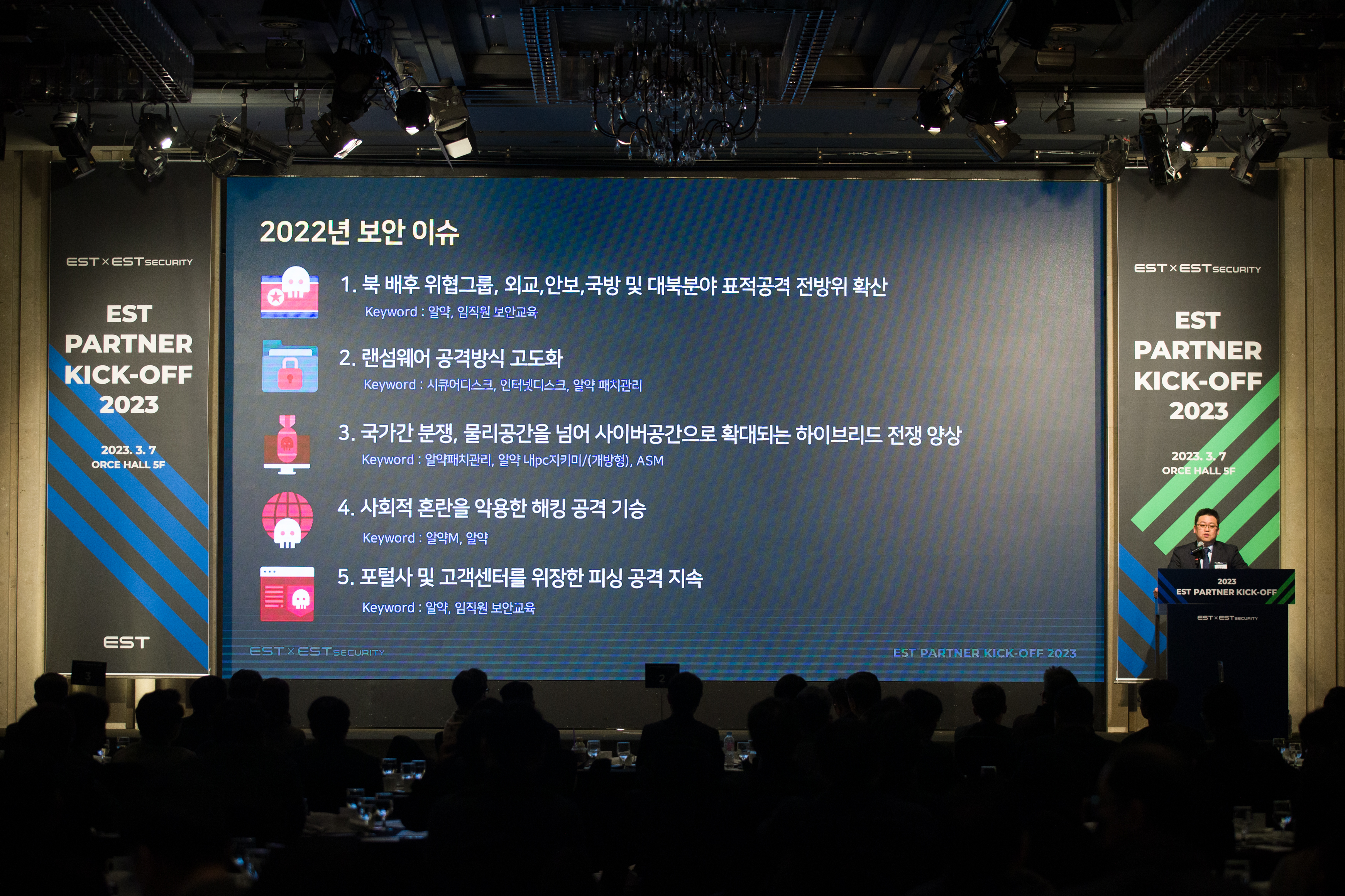 이번 행사는 이스트소프트와 이스트시큐리티의 대표이사 인사를 시작으로, ▲23년 사업전략 및 지원 정책 소개 ▲최근 보안 이슈 및 23년 위협 전망 ▲엔드포인트 동향 및 제품로드맵을 소개하였으며 ▲문서중앙화 사업 최신 동향 및 제안포인트를 공유하는 자리를 가졌습니다.