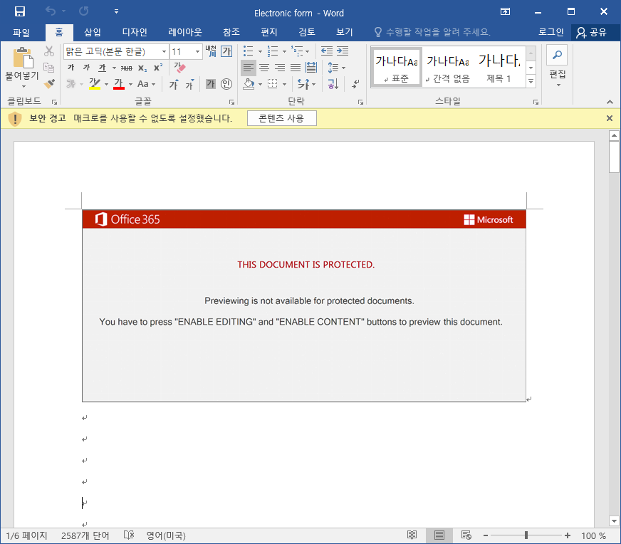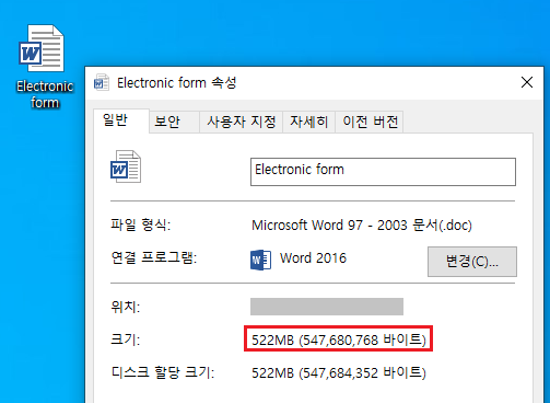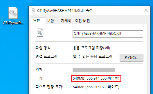 doc 파일을 실행하면, 악성 매크로가 동작하면서 공격자가 미리 지정해 놓은 C&C에 접속하여 악성 dll 파일을 내려받아 실행하는데, 이때 실행하는 doc 파일과 dll 파일의 용량이 500MB이상이라는 특징을 갖고 있습니다.