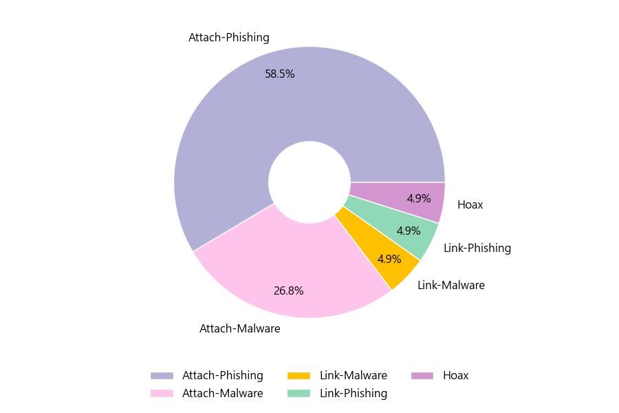 악성 이메일을 유형별로 살펴보면 41건 중 Attach-Phishing형이 58.5%로 가장 많았고 뒤이어 Attach-Malware형이 26.8%를 나타냈습니다.
