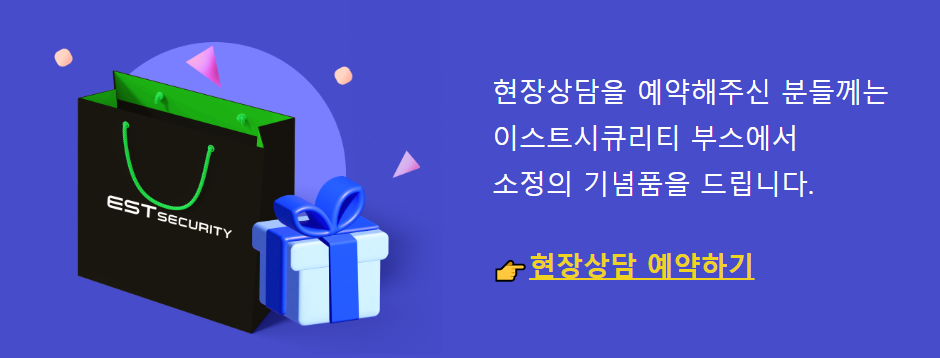 이스트시큐리티가 준비한 미니세미나는 각 10분씩 진행되며, 세미나 이후 발표자에게 자유롭게 질문하실 수 있습니다. 그 외에도 언제든 부스 내 데모시연 공간에서 제품 소개와 시연을 받으실 수 있으니, 이스트시큐리티 부스로 방문하시어 각 기업과 기관에 꼭 필요한 보안 솔루션에 대한 상담과 안내를 받아보시고 다양한 기념품도 받아가시기 바랍니다.