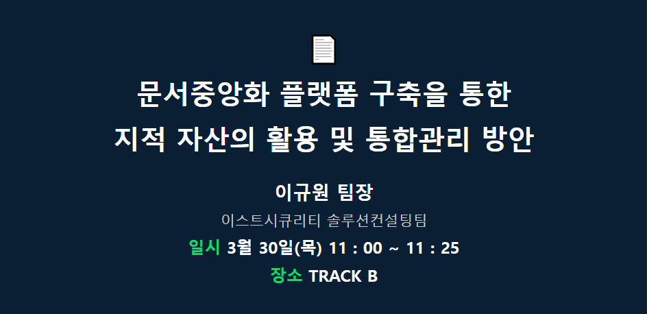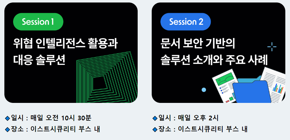 또한 이번 eGISEC 2023에서는 이스트시큐리티가 직접 진행하는 여러 세미나도 준비되어 있습니다. 이스트시큐리티 전시 부스(#S07) 내에서 매일 2회 진행되는 미니 세미나와, 전시회 장내에 따로 마련된 컨퍼런스 룸에서 진행되는 문서중앙화 플랫폼 구축을 통한 지적 자산의 활용 및 통합관리 방안 세션 발표를 통해 최신 보안 동향과 함께 문서중앙화 활용 사례까지 알아보는 의미 있는 세션을 만나보시길 바랍니다.