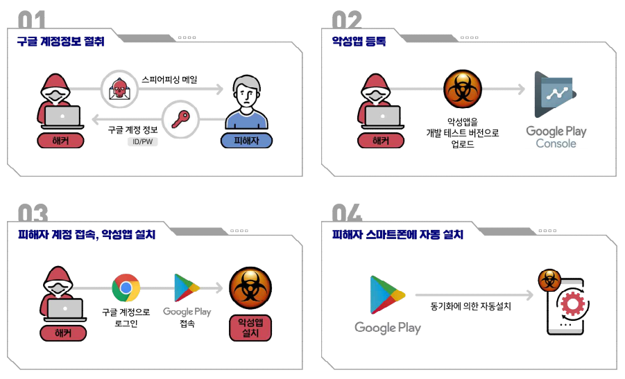 공격자는 피싱메일 등으로 사전에 절취한 피해자 구글 계정으로 로그인 후 구글 플레이의 웹-스마트폰 동기화 기능을 악용하여 공격 대상자가 별도 조작 없이도 안드로이드 스마트폰에 악성 앱을 설치합니다.